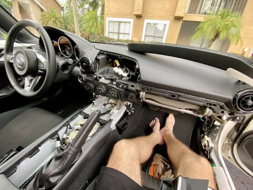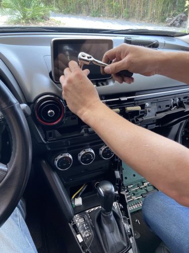 No need to disassemble your entire center console. There is a great video on YouTube showing you how to remove the old unit with just a flat head screwdriver. Tip, use the flathead to press down on the tabs while pushing with your free hand from behind (access through the glove compartment). This will loosen it enough to pry it out.